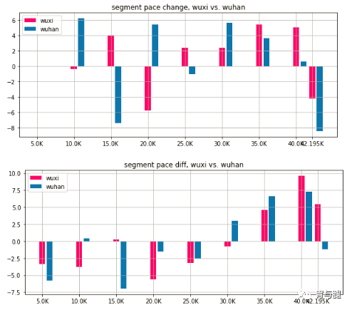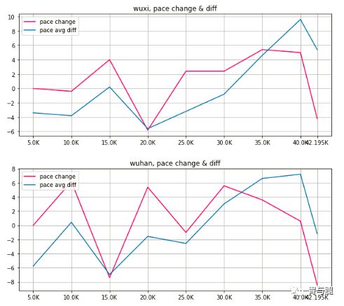 我的结论是,还真不好说!作为拿了文科文凭的理工科,数据更值得信任。于是我把两次比赛的分段时间进行处理,主要对比了分段配速环比变化(change)和分段配速与平均配速差别(diff):