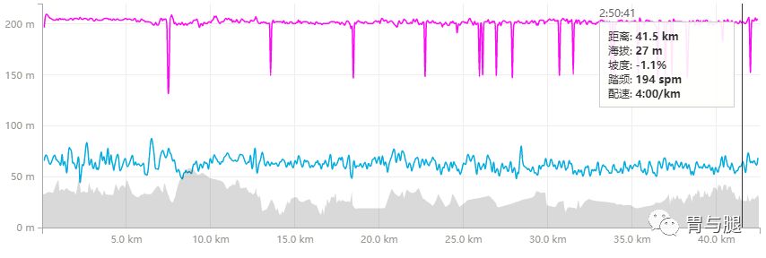 这两次比赛对于冬训另外一个训练项进行了验证:步频。在整个比赛中,基本上都保持在190-194spm,这也是冬训时候刻意训练的目标:配速降低时候不降低步频,而是让步幅降低。
